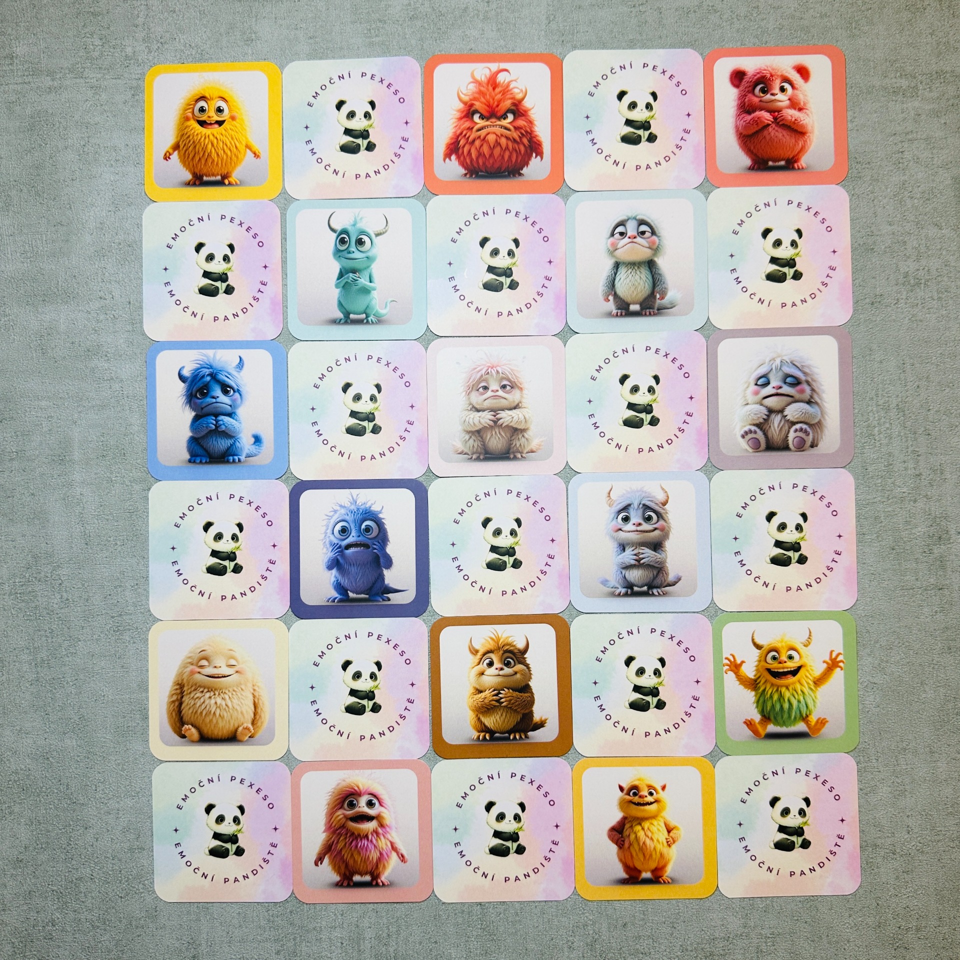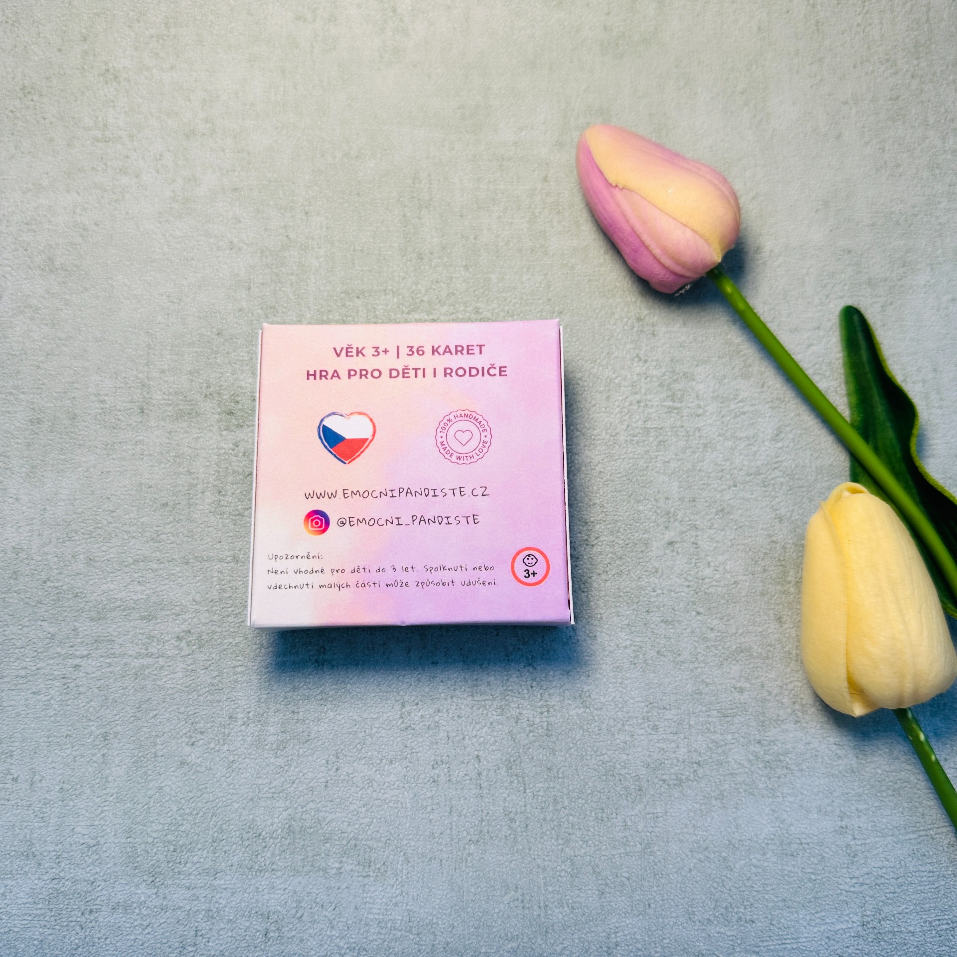 Na kartách nejsou názvy emocí, což je záměr. Dítě nejdřív emoci vnímá, teprve potom ji pojmenuje. Díky tomu je učení hlubší a přirozenější.
